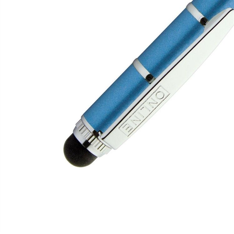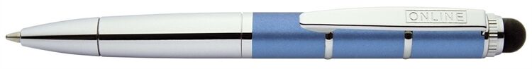 Der Piccolo Design-Kugelschreiber Stylus von ONLINE, das trendige Mini-Schreibgerät aus Metall passt garantiert in jede modische Agenda und in die kleinste Tasche. Ausgestattet ist der Dreh-Kugelschreiber mit hochwertigem Stylus-Tip/Touch Spitze, in super softer Qualität zum Schreiben, Skizzieren und Tippen auf Smart Phones und Tablet PCs. Dreht man das Schreibgerät um, ist der Kugelschreiber mit Metallclip und der D1-Standardmine, Schreibfarbe Blau für jeden Einsatz bereit.