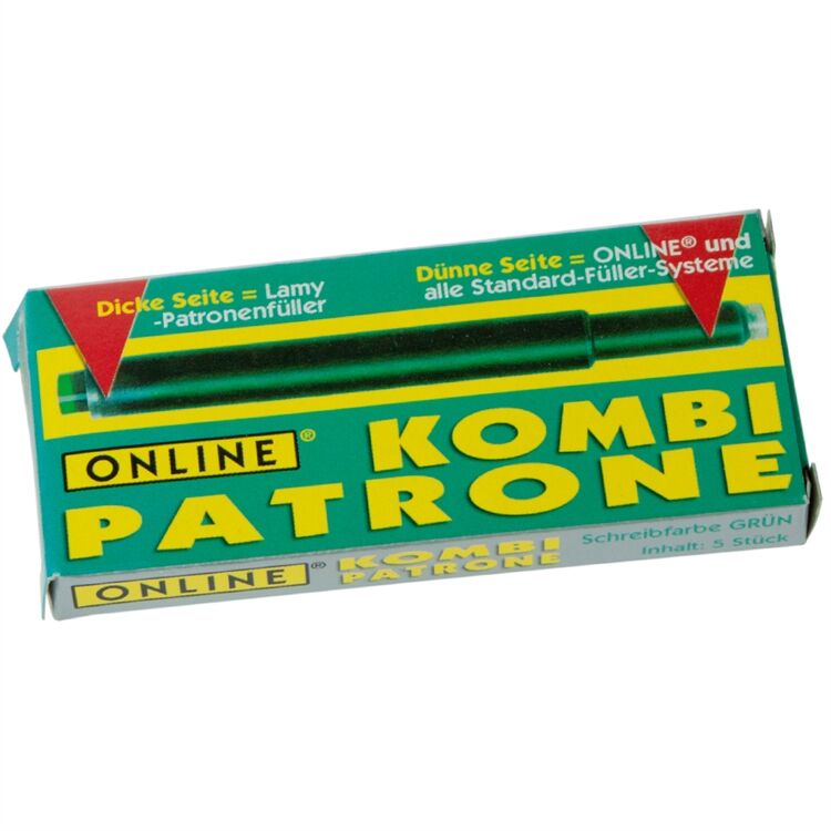ONLINE Kombipatrone passt immer:dünne Seite für ONLINE + Standard-Füllersysteme, dicke Seite für LAMY-Füller, hochwertiger Tinte, grün, 12 Päckchen à 5 Patronen, mit Rabazzi-Sammelpunkten