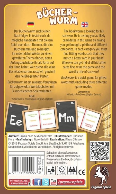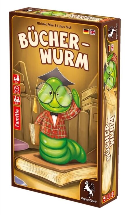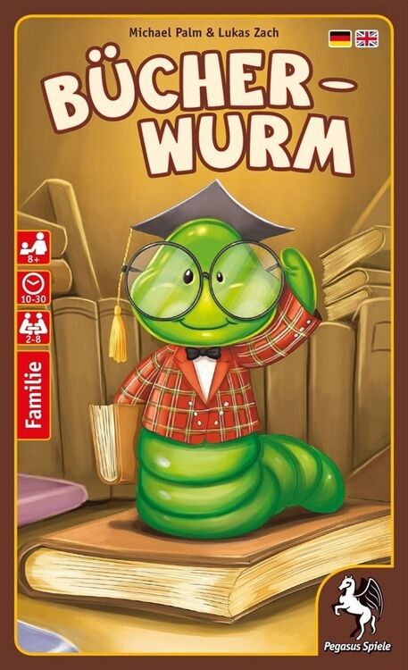 Eine Handvoll Anfangsbuchstaben und eine Kategorie, zu der es Wörter zu finden gilt. Früher oder später gelingt dies jedem, doch in Bücherwurm ist nicht nur Einfallsreichtum, sondern auch Schnelligkeit gefragt. Denn wer hier zuerst mit jeder seiner Handkarten passende Begriffe einleitet, punktet. Die verschiedenen Spielvarianten ermöglichen sowohl das geordnete Nacheinander als auch den turbulenten, offenen Schlagabtausch. Ein rasantes Vergnügen für aufgeweckte Wortakrobaten. Ab 2 Spielern. Ab 8 Jahren. Spieldauer: ca. 10-30 Minuten.