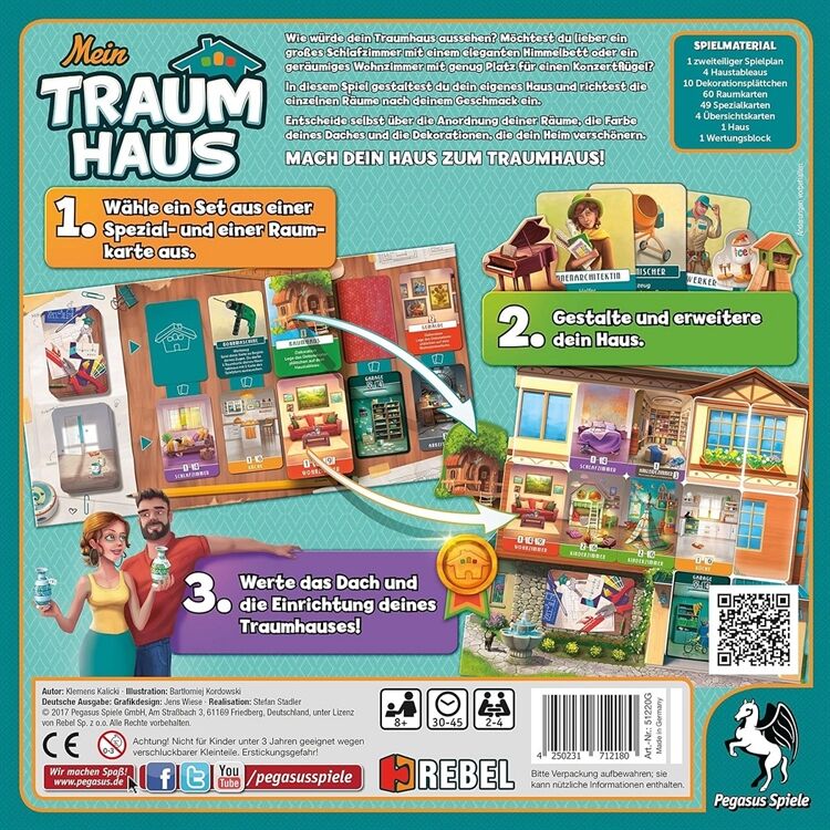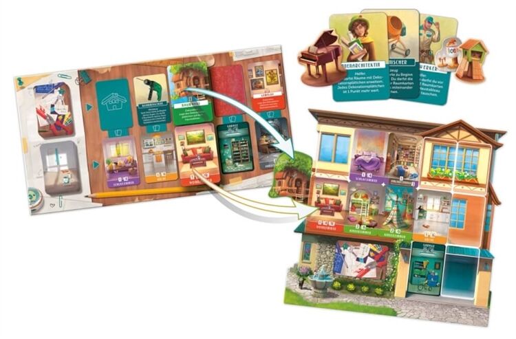 Nach langem Warten ist der Traum von den eigenen vier Wänden endlich in Erfüllung gegangen. Doch noch ist das neue Heim gähnend leer. Zeit, die Ärmel hochzukrempeln und einzurichten, was das Zeug hält! Über 12 Runden werden Räume gebaut, mit nützlichen Gegenständen dekoriert und durch die Hilfe von Spezialisten perfektioniert. Wer am Ende das wertvollste Haus gebaut hat, wird zum Heimwerkerkönig. Vom Keller bis zum Dach bleiben dabei keine Wünsche offen: ob es der eigene Wellnessbereich mit Sauna oder das edle Klavier im Wohnzimmer ist, das man schon immer haben wollte: in Mein Traumhaus sind dem Gestaltungsdrang keine Grenzen gesetzt. Mein Traumhaus bietet ein einzigartiges Spielerlebnis, in dem die Spieler im freundlichen Wettstreit die schönsten Häuser bauen. Mit detailverliebten Spielmaterial und einfachen Regeln kommen alle Hobby-Innenarchitekten voll auf ihre Kosten.