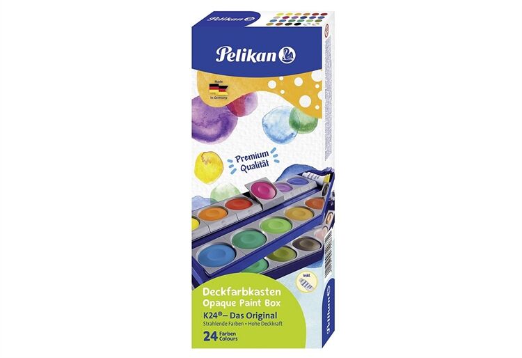 24 Farben nach DIN 5023, inkl. Deckweiß, auswechselbare Farbschälchen, Deckel mit vielen Mischtöpfen, zum Reinigen leicht abnehmbar, beschriftbares Namensfeld im Deckel