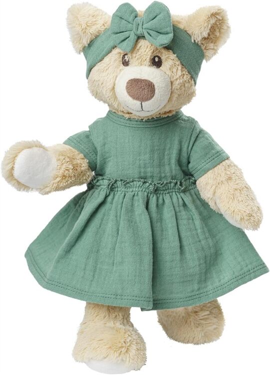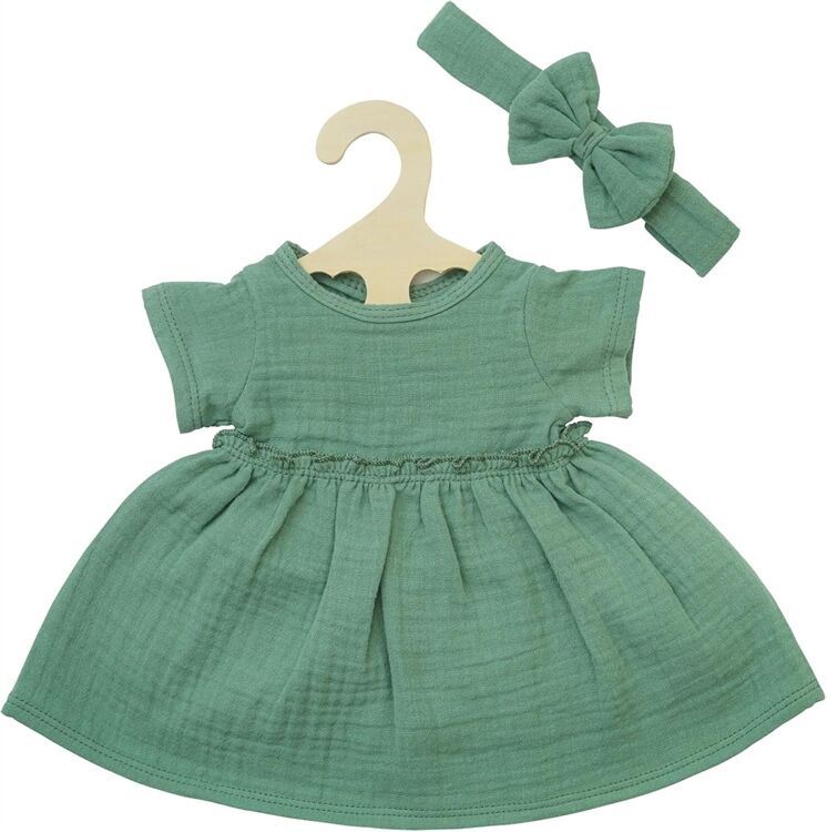 ein Puppenkleid aus 100 % Bio-Baumwolle und ein Haarband, Farbe Salbeigrün, in der Größe 35 - 45 cm