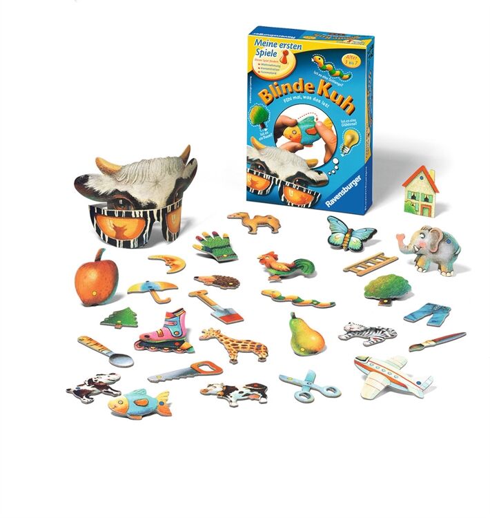 Ravensburger Blinde Kuh. Kuhmaske aufsetzen und los geht's: Blind wird ein Gegenstand gezogen und mit viel Fingerspitzengefühl ertastet. Was das wohl ist, Maus oder Elefant? Wer die meisten Formen errät, hat gewonnen. Mit 40 kindgerechten Formen werden spielerisch Tastsinn und Fantasie gefördert. Dieses Spiel fördert: Wahrnehmung, Konzentration, Feinmotorik. 1 bis 4 Spieler ab 3 Jahre.