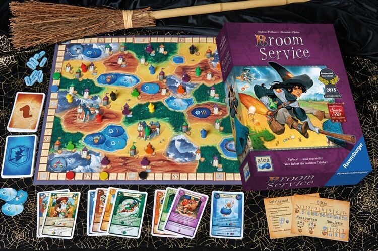 Gehen die Zaubertränke zur Neige? Und es müssen neue her? Dann ist es Zeit für den Broom Service" . Kaum angefordert, schon schwingen sich die fixen Hexen auf ihre flotten Besen und schwärmen mit zahlreichen Fläschchen im Gepäck ins magische Reich aus. Ob es um die Herstellung oder das Ausliefern der Zaubertränke geht, ob Helfer wie Wurzelsepp, Fruchtzwergl oder Donna Wetta zur Seite stehen, immer geht es darum, die richtige Karte im rechten Moment auszuspielen. Es ist wie verhext! Für 2-5 Spieler. Ab 10 Jahren.