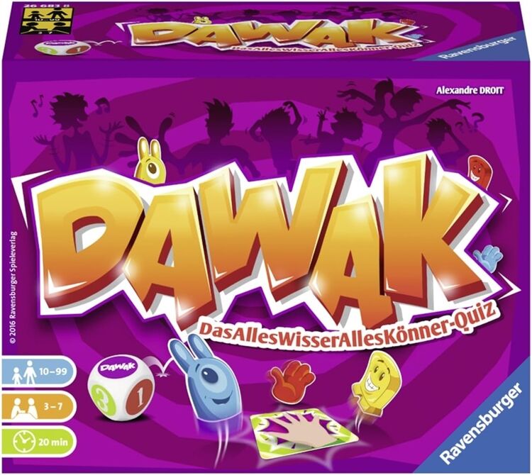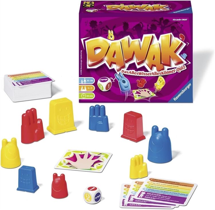 Sind wir nicht alle ein bisschen DAWAK? Seid ihr bereit für mehr als 1000 verrückte Fragen und Aufgaben? Dann ist dieser abgedrehte Partyspaß genau das Richtige! Denn wer Dawak-Champion werden will, muss schnell und clever sein: Nur wer als erstes die Antwort weiß, punktet! Für 3-7 Spieler. Ab 10 Jahren. Spieldauer: ca. 20 Minuten.