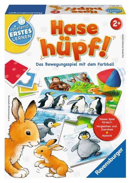 Wer kann hüpfen wie ein Hase - oder stampfen wie eine Elefant? Die liebevoll illustrierten Puzzlekarten zeigen acht unterschiedliche Tierarten, die die Kinder nachahmen dürfen. Mit der spielerischen Bewegung wird die Grobmotorik gefördert, beim Zuordnen und Puzzeln der Tierkarten ist viel Geschick gefragt. Eine Besonderheit ist der bunte Farbball. Er wird geworfen und bestimmt die Farbe der nächsten Tierkarte. So lernen die Kinder vier Farben kennen und es kommt Bewegung ins Spiel! Für 1 - 4 Spieler ab 2 Jahren. Spieldauer: 10 - 15 Minuten.