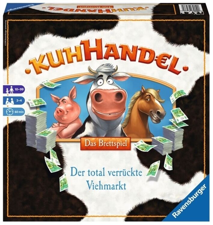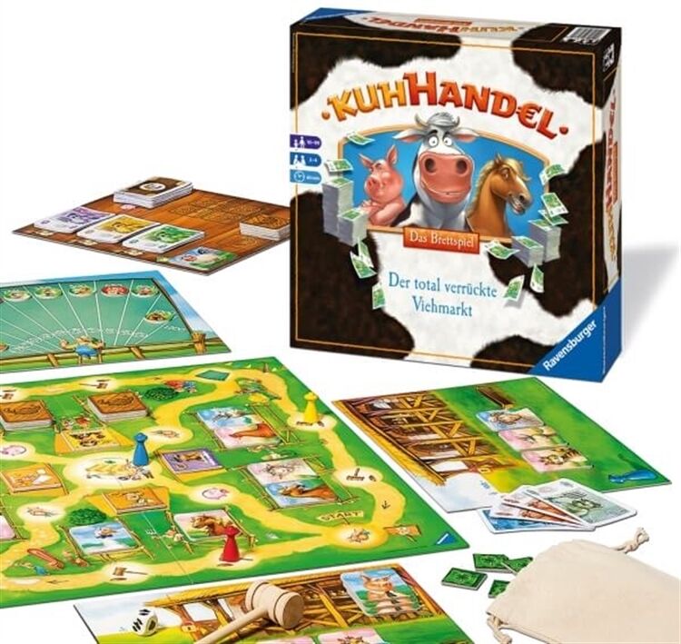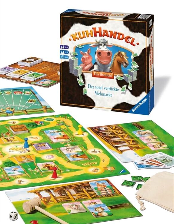 Erleben Sie den Kartenspiel-Klassiker erstmals als Brettspiel! Hier erwarten Sie Viecher, Versteigerungen und noch viel mehr: Erhöhen Sie auf dem Markt den Wert Ihrer Tiere, schnappen Sie sich beim Sparschwein frisches Geld und versuchen Sie an der Losbude Ihr Glück! Ob im knackig- kurzen Einstiegsspiel oder im Profispiel für Kuhhandel-Kenner: Abwechslung ist garantiert! Denn 10 verschiedene Versteigerungen sorgen für immer wieder neue, spannende Partien. Und mit den Tierbabys kommt jetzt auch der Nachwuchs mit ins Spiel! Kuhhandel Brettspiel: Mehr Kuhhandel geht nicht. Für 2-4 Spieler. Ab 10 Jahren. Spieldauer: ca. 60 Minuten.