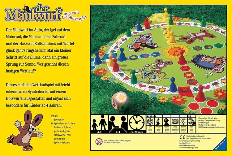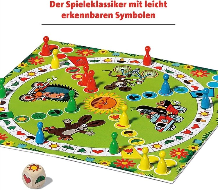 Mit Der Maulwurf und sein Lieblingsspiel von Ravensburger wird das Kinderzimmer zum Wettrennen für den Maulwurf im Auto den Igel auf dem Motorrad die Maus auf dem Fahrrad und den Hasen auf Rollschuhen. Dank des Würfelglücks geht es ringsherum und mal einen kleinen Schritt auf die Blume dann wieder ein großer Sprung zur Sonne. Aber wer gewinnt den lustigen Wettlauf? Mit dem Holzwürfel auf dem die Symbole leicht erkennbar sind eignet sich das Spiel perfekt für Kinder ab 3 Jahren und fördert das erste Regelverständnis genaues Schauen und Konzentration.