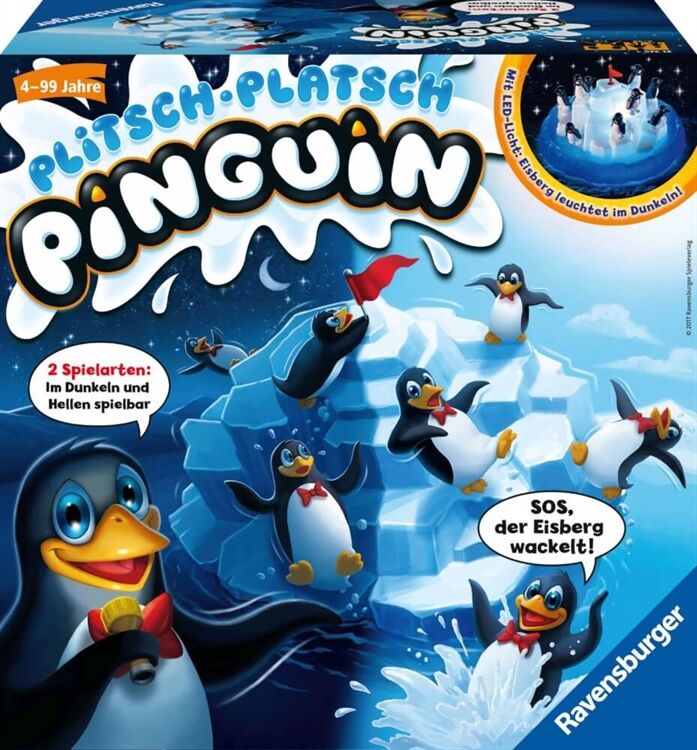 Ravensburger - Plitsch-Platsch Pinguin: Erlebe jetzt noch mehr Spaß und Spannung, indem du deine Pinguine auch im Dunklen geschickt auf dem hellleuchtenden Eisberg platzierst. Wer als Erster alle seine Pinguine auf dem wackligen Eisberg unterbringt, gewinnt. Mit einer neuen leichteren Spielvariante für Kinder ab 4 Jahren. Inhalt: 1 Eisberg mit blauer Spielbasis und roter Fahne, 1 puzzlebarer Pappring (drei Pappteile), 20 Pinguine, 1 Lampe. Ravensburger - Plitsch-Platsch Pinguin: Erlebe jetzt noch mehr Spaß und Spannung, indem du deine Pinguine auch im Dunklen geschickt auf dem hellleuchtenden Eisberg platzierst. Wer als Erster alle seine Pinguine auf dem wackligen Eisberg unterbringt, gewinnt. Mit einer neuen leichteren Spielvariante für Kinder ab 4 Jahren.