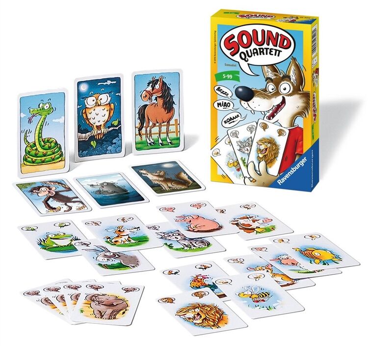 Ravensburger - Sound Quartett: Bei diesem Quartett wird anhand von Tierlauten nach Karten gefragt. Hier dürfen die Spieler muhen, blöken und wiehern, was das Zeug hält. Hat der Gefragte die Karte nicht, antwortet er mit einem Pupsgeräusch. Wer gewinnt die meisten Sets?  Der Karten-Klassiker mit tierischer Lachgarantie!