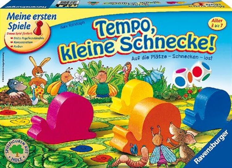Wer hat beim Rennen zu den grünen Salatköpfen die Fühler vorn? Dieses erste Farbwürfelspiel ist ein wahrer Klassiker für kleine Kinder. Welche der sechs großen Holzschnecken erreicht zuerst den leckeren Salatkopf im Ziel?