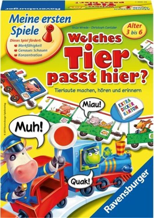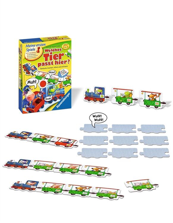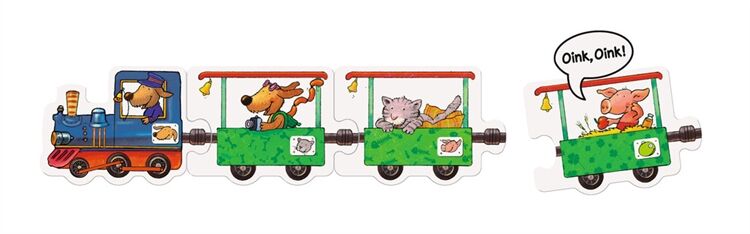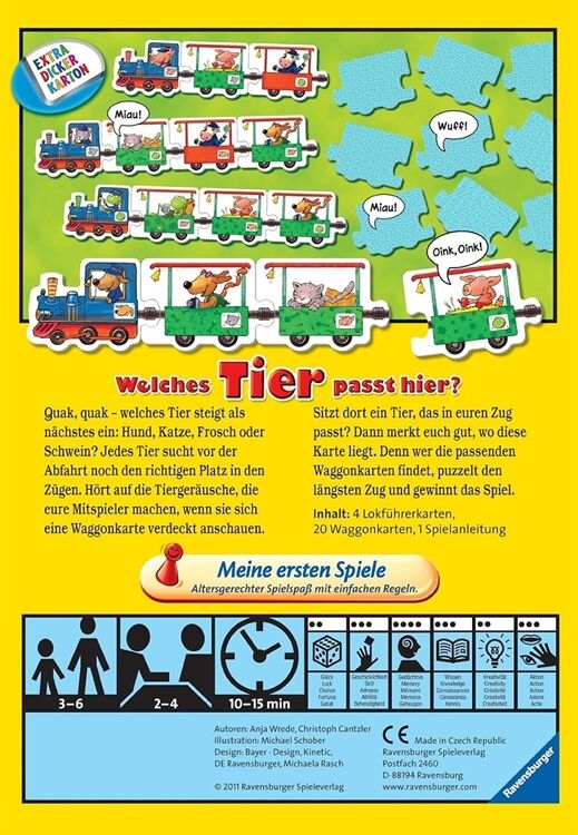 Jedes Tier sucht vor der Abfahrt noch den richtigen Platz im Zug. Alle hören gut zu, welche Tiergeräusche die Mitspieler machen, wenn sie sich eine Waggonkarte verdeckt anschauen. Sitzt dort ein Tier, das in den eigenen Zug passt? Dann gut merken wo diese Karte liegt. Denn wer die passenden Waggonkarten findet, hat am Schluss den längsten Zug und gewinnt das Spiel. Dieses Spiel fördert: Merkfähigkeit, genaues Schauen, Konzentration