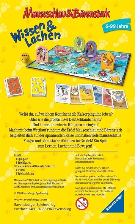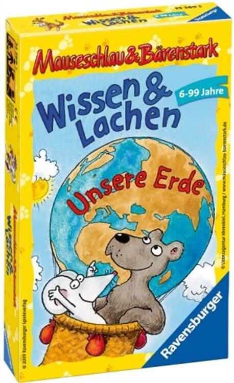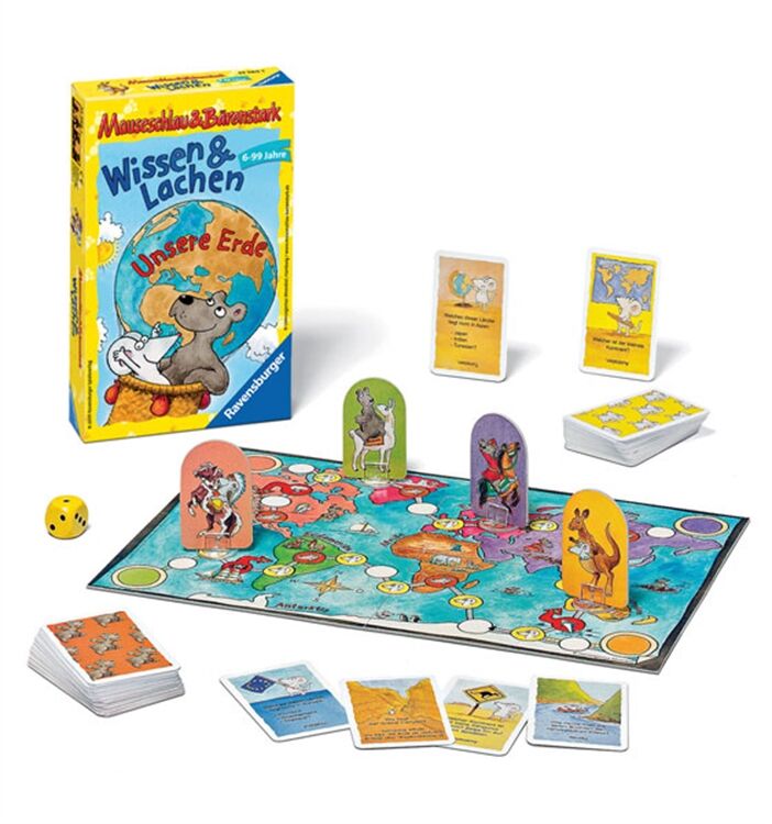 Ravensburger - Mauseschlau & Bärenstarkes Wissen und Lachen: Ein spannender Wettlauf rund um die Erde! Mauseschlau und Bärenstark sind mit dabei: Sie stellen mauseschlaue Fragen und fordern zu bärenstarken Aktionen auf. Dabei können die Spieler ihr Wissen über Tiere, Länder und Kontinente testen, aber auch gemeinsam lachen!