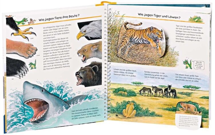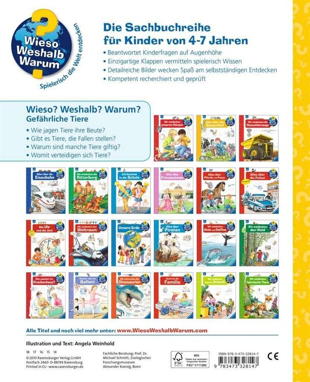 Mit dem Wissensbuch Gefährliche Tiere aus der Ravensburger-Reihe Wieso? Weshalb? Warum? gehen Kinder auf eine Entdeckungsreise durch die Tierwelt, Mit Zähnen, Krallen, Stacheln, Hörnern, Panzern, Gift und speziellen Tricks machen Tiere Beute oder verteidigen sich, Wir stellen die spannendsten Besonderheiten mithilfe von eindrucksvollen Klappen vor, Raubkatzen mit messerscharfen Klauen, Haie mit spitzen Zähnen, giftige Schlangen und Spinnen - Tiere brauchen spezielle Waffen und andere Tricks, um Beute zu machen, ihre Jungen und ihr Revier zu beschützen, aber auch um sich selbst zu verteidigen, Wo leben die gefährlichsten Tiere der Erde? Wer lauert seiner Beute auf? Gibt es Tiere, die Fallen stellen? Und wie reagieren eigentlich wehrlose Tiere auf die Angriffe von anderen? Dieses Buch von Ravensburger führt Kinder auf eine Expedition in die manchmal gefährliche Tierwelt und vermittelt Respekt vor allen Lebewesen, ohne Ängste zu schüren, Ab 4 Jahren,