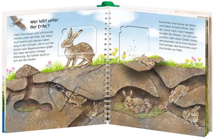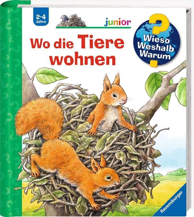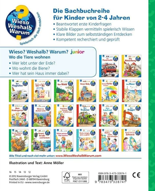 Mit dem Wissensbuch Wo die Tiere wohnen aus der Ravensburger-Reihe Wieso? Weshalb? Warum? erfahren Kinder allerlei Wissenswertes über die Behausungen von Tieren, Menschen wohnen in Häusern, das weiß jedes Kind, Auch Hund und Katze fühlen sich hier sehr wohl, Aber wo wohnen die vielen anderen Tiere? Dieses Buch zeigt die Nester von Gimpel, Storch und Schwalbe, den unterirdischen Bau von Kaninchen und Maulwurf, die Burg des Bibers und sogar Fledermäuse gibt es zu entdecken! Ob Vogelnest, Eichhörnchenkobel, Bienenstock, Erdhöhle oder Biberburg - in diesem Buch lernen Kinder ganz unterschiedliche Arten von Wohnungen heimischer Tiere kennen, Und wer hat sein Haus immer dabei? Sie versteckt sich auf jeder Doppelseite im Buch und möchte gern gefunden werden! Mit emotionalen und naturalistischen Szenen, Ab 4 Jahren, Mit 16 farbig illustrierten Seiten,
