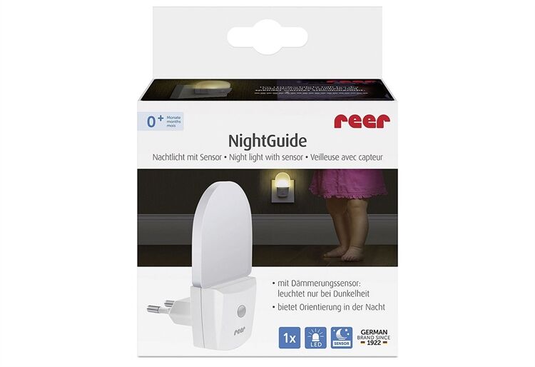 NightGuide - Nachtlicht mit Sensor. Sanftes Licht beruhigt Kinder in der Dunkelheit und macht Stolperfallen sichtbar. Dämmerungssensor: leuchtet nur bei Dunkelheit, schönes & dezentes Design, für alle herkömmlichen Steckdosen geeignet, energiesparende LED Technologie ohne Wärmeentwicklung, Stromverbrauch: 0,5W, LED-Lebensdauer bis zu 25.000 Betriebsstunden, Lichtfarbe: warmweiß (ca. 2700K). Inhalt: 1 Stück.