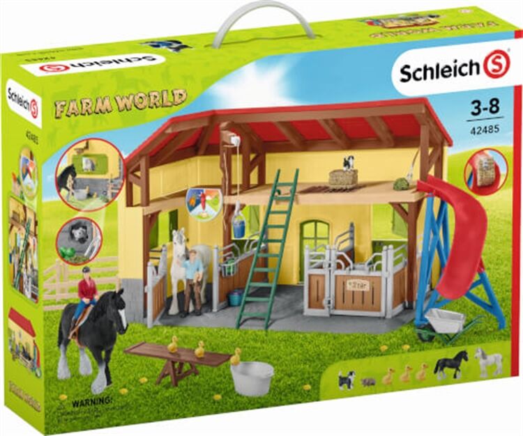 Der neue bunte Schleich® Pferdestall bietet viele tolle Spielfunktionen und sorgt bei den Kleinen für langanhaltenden Spielspaß! Denn mit den 7 süßen Tieren, 2 Pferdeboxen, Bauer Paul und Bäuerin Laura und natürlich jeder Menge Zubehör lässt sich die tägliche Arbeit auf dem Hof leicht ganz nachspielen, Während sich die Bäuerin für den Ausritt bereit macht, befördert Bauer Paul mit dem Flaschenzug wieder neues Futter auf den Heuboden, Über die beweglichen Transportrollen ist es für ihn aber immer ganz leicht die Heuballen zur Futterrutsche zu bringen damit sie von dort aus rasant in die Schubkarre fallen, Durch die Fütterungsanzeige kann Schritt-für-Schritt eingestellt werden, was die Tiere gerade bekommen sollen, Ob der Bauer wohl die süße Maus entdeckt hat, die im Mauseloch sitzt? Der Pferdestall lässt sich aufgrund der Sticker nach belieben des Kindes personalisieren, Die Schleich® Figuren sind alle detailgetreu modelliert und stehen für pädagogisch wertvolles Spielen,
