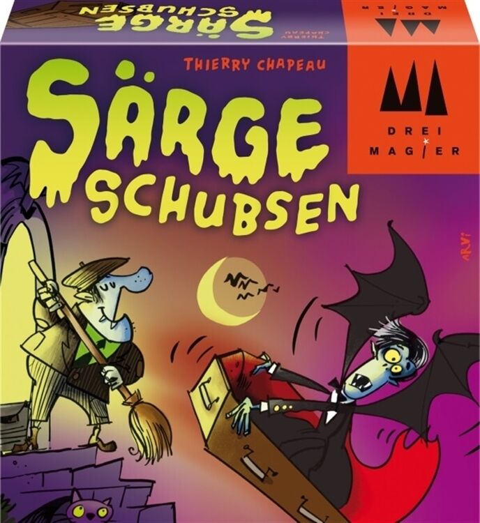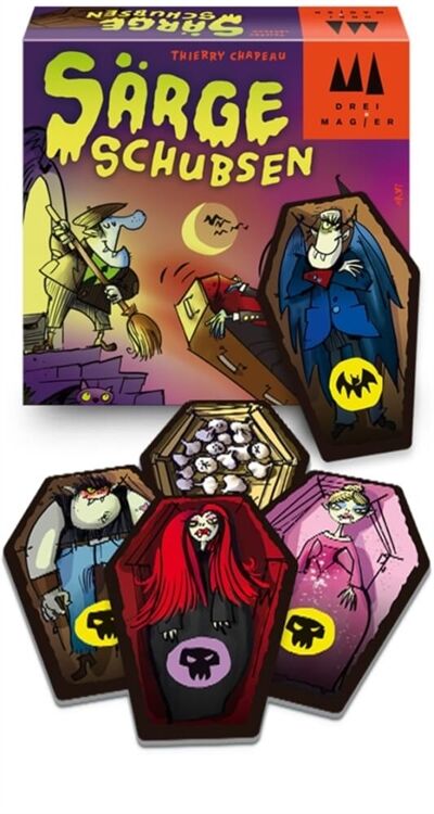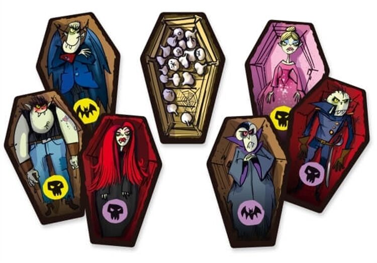 Bringt eure Vampire so schnell wie möglich in den Sarg und dann weg damit! Wenn die passende Kombination aus Hintergrundfarbe und Symbol gewürfelt wird, müsst ihr als erster auf die Knoblauch-Karte schlagen. Aber nichts verwechseln! Denn wer sich irrt, bekommt noch mehr Vampirbesuch Für 2-6 Spieler. Ab 8 Jahren. Spieldauer: ca. 15 Minuten.
