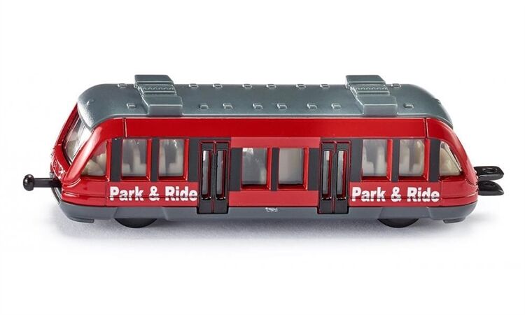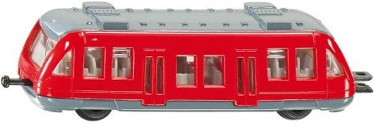 Metallmodell eines Nahverkehrszugs in kleinem Maßstab. Leichtläufige Räder und kindliche Optik. Die Standard-SIKU-Eisenbahnkupplungen an Front und Heck ermöglichen das Ankoppeln weiterer Nahverkehrszugmodelle.