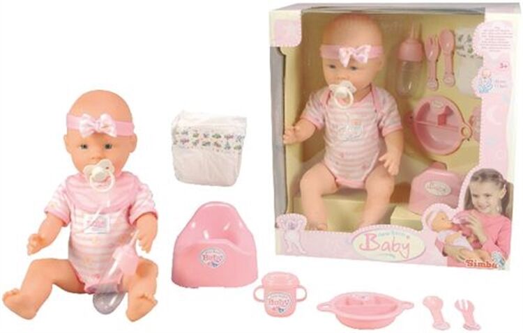 Die 43 cm große New Born Baby Puppe kommt mit reichlich Zubehör und macht es so der Puppenmutti besonders einfach ihr Baby zu versorgen. Neben Latz, Windel, Eßgeschirr und Fläschchen ist auch das Töpfchen enthalten. New Born Baby kann ohne Batterien richtig Wasser trinken und danach aufs Töpfchen gehen.