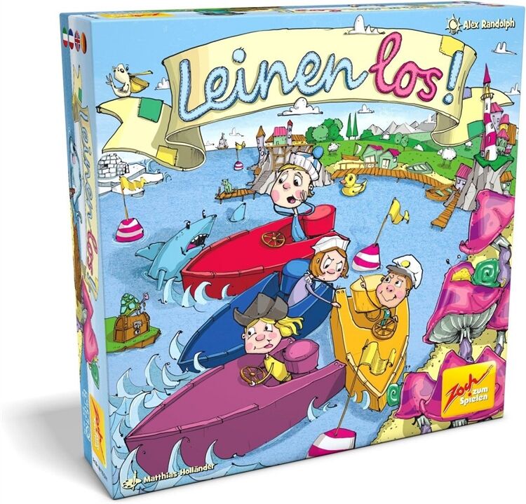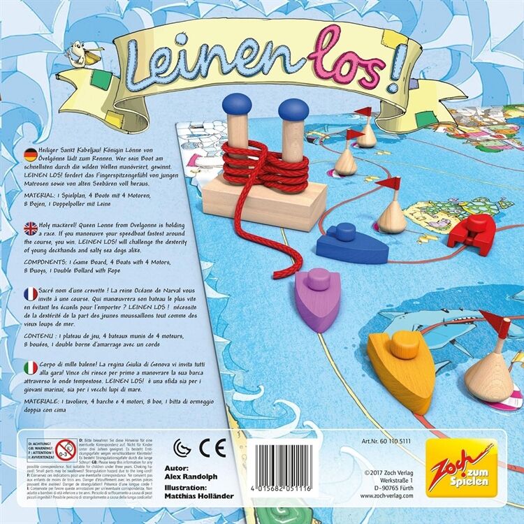ZOCH Leinen los: Auf hoher See soll das eigene Boot mit einer Fingerspitze um acht Bojen herumgeleitet werden, Das wäre wohl ganz einfach# aber diese Boote sind anders: Sie bestehen aus zwei Teilen, die nur lose miteinander verbunden sind, Der kleine Bordmotor lässt den Bootskörper allzu leicht aus der gewünschten Richtung ausbrechen, Mit Geschick, Konzentration und starken Nerven trotzen die Spieler den von Haien gespickten Gewässern, Die Zeit ist dabei knapp, denn jede eigene Bootsetappe endet sofort, wenn ein Mitspieler die Aufgabe bewältigt hat, ein Anlegetau achterförmig, um einen Kreuzpoller zu schlingen, Weil der Spielplan einen einfacheren und einen schwierigeren Bootsparcours zeigt, können jüngere Kinder im direkten Wettbewerb gegen große Kinder oder Erwachsene antreten, 2-4 Spieler, Spieldauer: ca, 20 min, Ab 6 Jahre,