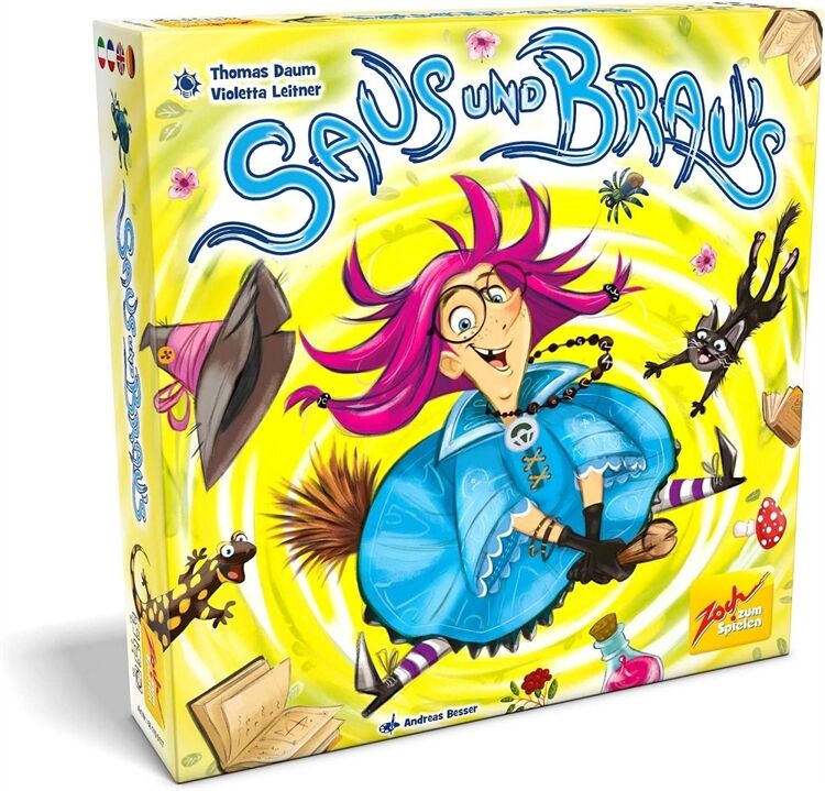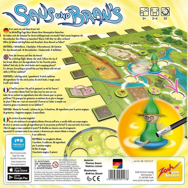 Zoch Saus und Brau's: Erst saust sie, Dann braut sie, Wirbelhexe Winnie braut ihren Lieblingstrank, Aber die Zutaten dafür liegen kreuz und quer verstreut in Berg und Tal, Also schwingt sich Winnie auf den Hexenbesen und beginnt einen turbulenten Sammelflug, Vom Zauberstab der Spieler angetrieben, wirbelt Winnie um die eigene Achse, bis ihre Besenspitze die Flugrichtung bestimmt hat, Eine ausliegende Zutat auf der so angesteuerten Route kann Winnie einsammeln, wenn sie in ihren Hexenbüchern den passenden Hexenzauber dazu findet, Aus den am Spielplan optisch wunderschön befestigten Klappbüchern gilt es das Richtige zu finden - und zu merken, Doch zur allgemeinen Verwirrung vertauschen die verhexten Bücher beim Erscheinen von Spinnen und Salamandern auch noch ihre Plätze, Die Hexenkraft eines guten Fingerspitzengefühls und die Findigkeit eines wachen Köpfchens sorgen für total verhexte Erfolgserlebnisse, 2-4 Spieler, Ab 5 Jahre,