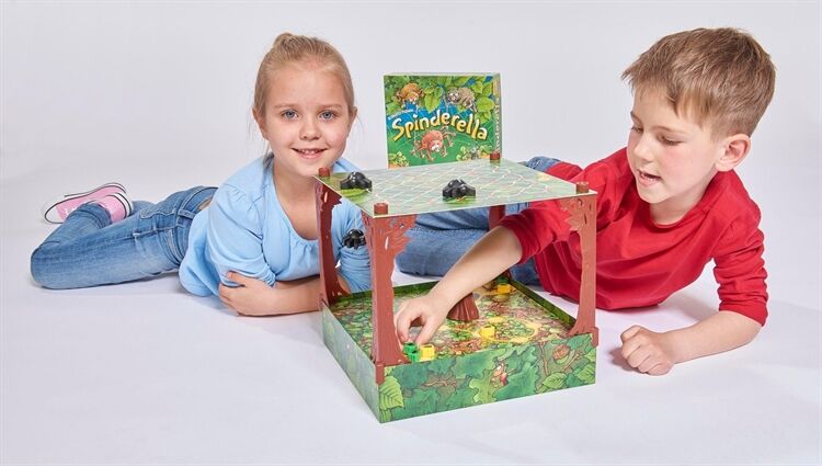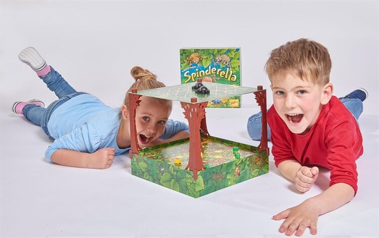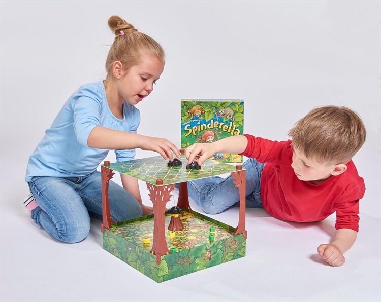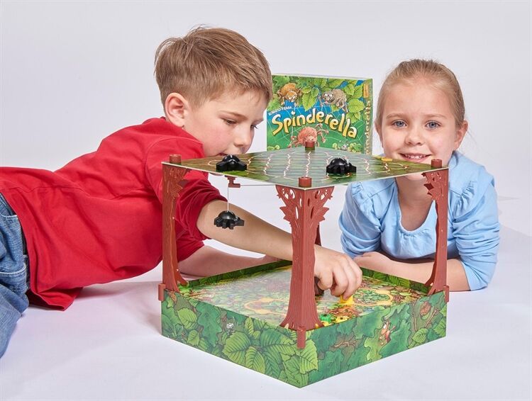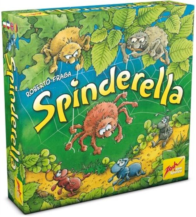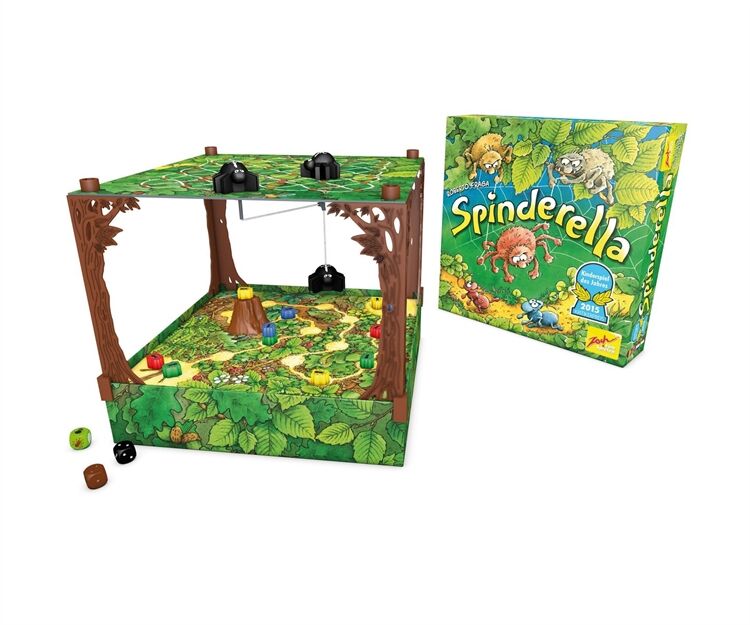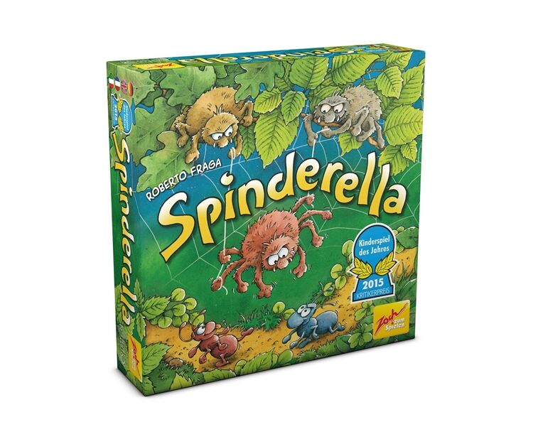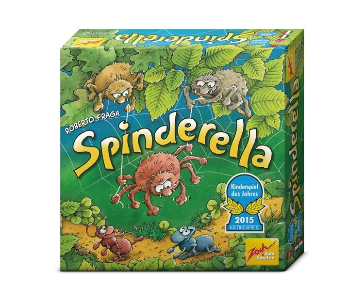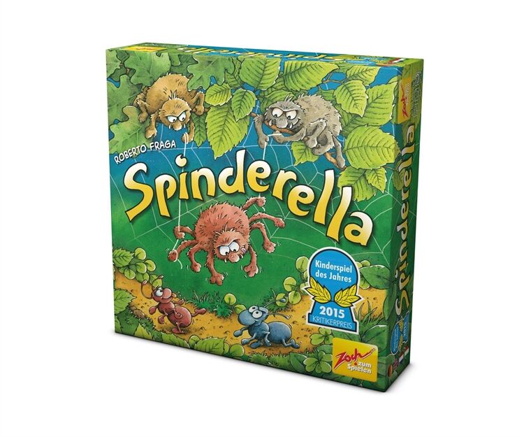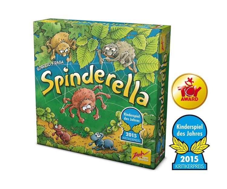 Spinderella ist eine dreidimensionale Waldneuheit mit einzigartigen Seil- und Spielzügen, Die Spinnenbrüder Roberto und Klaus seilen ihre Schwester Spinderella am Faden bis tief hinunter, wo am Waldboden die Ameisenstraßen verlaufen, Dort mischt das Spinnenmädchen den Ameisenmarathon auf, dessen Sieger die Spieler im Spielverlauf ermitteln, Während dabei jeder Spieler versucht, seine drei Ameisen als Erster ins Ziel zu bringen, fängt Spinderella von oben die eifrigen Krabbler der Mitbewerber immer wieder ab, Dazu muss es ihr gelingen, auf #Tuchfühlung# mit den kleinen Marathonläufern zu gehen, Ein mobiles, ausgehöhltes Rindenstück, das den Ameisen als Schutzschild dient, wird so zur hart umkämpften Trophäe der Termiten, Allerdings sind Ameisen darunter nicht nur sicher, sondern auch in ihrer Vorwärtsbewegung blockiert, Bei jedem Spielzug entscheiden drei Würfel und der aktive Spieler darüber, ob Spinnen oder Ameisen und vielleicht auch das Rindenstück bewegt werden, Wer mit Spinderellas Hilfe eine fremde Ameise schnappt, schickt diese zurück an den Start und darf selbst zusätzlich (nochmals) eine eigene Ameise vorwärts bewegen, Sieger ist, wer (als Erster) seine drei Ameisen ins Ziel gebracht hat, Kinderspiel des Jahres 2015, Ab 6 Jahre,