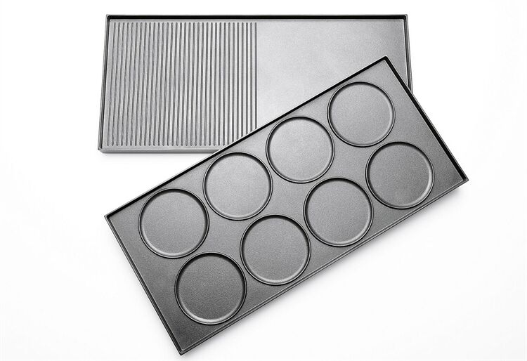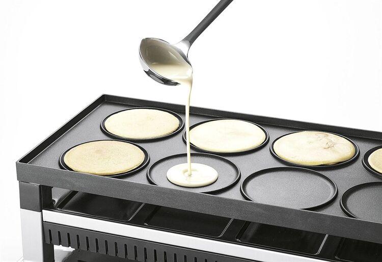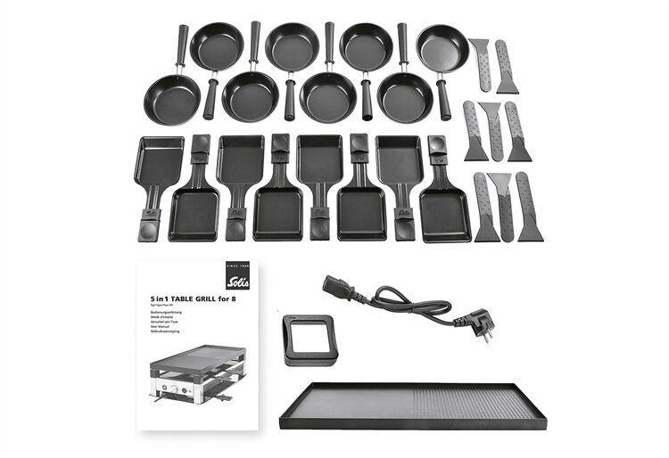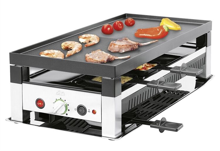 Für Raclette, Tischgrill, Mini-Wok, Crêpes oder Mini-Pizzen, Mit zuschaltbarer Unterhitze, Riesige und beidseitig verwendbare Grillplatte (eine Seite halb gerillt und halb flach für Fleisch, Gemüse etc. / eine Seite für Mini-Wok oder Crêpes), Kaltzone für heisse Pfännchen bei Essenspausen, Temperaturregler mit Leuchtanzeige (rot = aufheizen / grün = bereit), Aus Edelstahl, Inkl. 8 Raclettepfännchen, 8 Mini-Wok, 8 Spachtel und Anschlusskabel