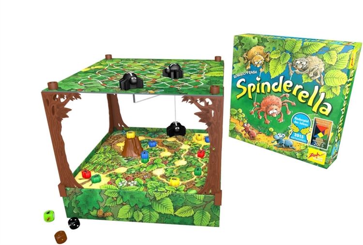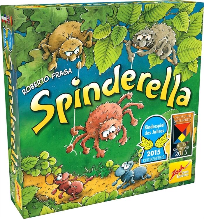 Kinderspiel des Jahres 2015 und Deutscher Spielepreis 2015: Spinderella Die Spinnenbrüder Roberto und Klaus seilen ihre Schwester Spinderella am Faden bis tief hinunter, wo am Waldboden die Ameisenstraßen verlaufen. Für 2 bis 4 Spieler ab 6 Jahren.