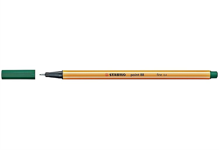 Strichstärke 0,4 mm, Faserspeicher, metallgefasste Spitze, geeignet für Schablone, lichtbeständige Tinte auf Wasserbasis, kann einige Tage offen liegen bleiben, ohne einzutrocknen, Kappe am Stiftende aufsteckbar