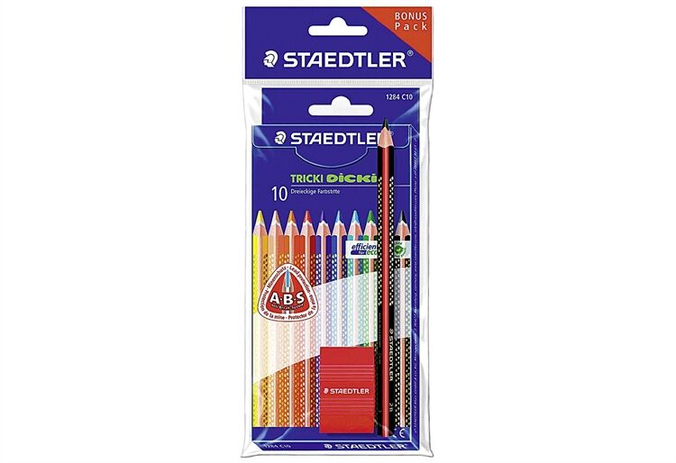 10er Kartonetui Dreikantform, mit Zugabe Schreiblernstift + Radiergummi
