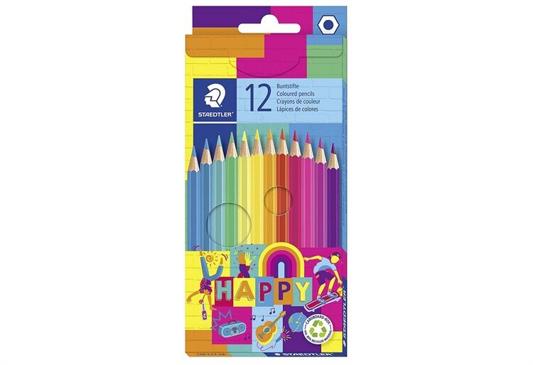 STAEDTLER 'Happy' Buntstifte. Zum Malen und Colorieren, für Schüler, Studenten und im Büro. Promotion-Kartonetui mit 12 Farben. Mit Hängelasche. Sonderaufmachung in farbenfroher Trendserie 'HAPPY'. Repräsentiert das Gefühl von Lebensfreude, Freiheit und Ausgelassenheit. Stifte in traditioneller Sechskantform. Stifte leicht spitzbar, poliert in der Farbe der Mine. Ø Stift ca. 8 mm, Ø Mine ca. 3 mm. CE konform. PEFC-zertifiziertes Holz. Verpackung (LxBxH): 197x89x10 mm.
