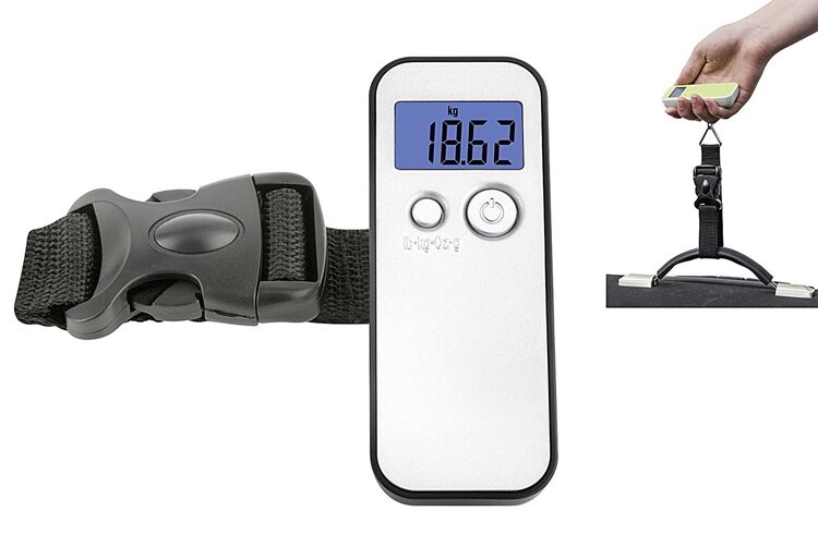 mit LCD Anzeige, zur Gewichtskontrolle des Reisegepäcks, klein und handlich, ideal für unterwegs, die Gegenstände können unten am Gurt eingehängt werden, danach heben sie die Waage an und das Messergebnis wird angezeigt - bis maximal 40 Kg, Tara-Funktion, automatische Ausschaltfunktion, Hintergrundbeleuchtung, Auflösung: 100 g, Gewicht: ca. 76 g, Batterien inkl.: 1 x 3V CR2032 (inklusive)