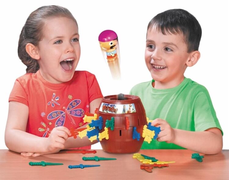 VORSICHT! - ein Säbel am falschen Platz und der Pirat springt aus dem Fass. Welche Öffnung im Fass ist die Richtige? Auf alle Fälle in jedem Spiel eine andere! Geschicklichkeitsspiel für 2-4 Spieler. Ab 4 Jahren.