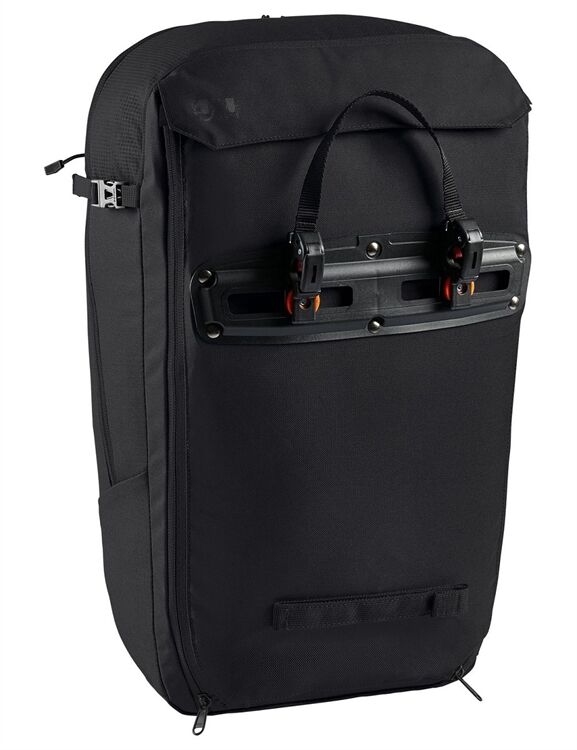 Rucksack oder Radtasche? Beides! Der Cycle 28 ist der ideale Begleiter für Commuter, die während der Fahrt einen sicheren Sitz der Tasche am Rad wünschen, sie dann aber in Bahn und Bus oder der Uni als Rucksack tragen möchten. Die Tasche wird über die mit einem Schloss absperrbaren QMR-Haken (z. B. Abus 145/20, nicht im Lieferumfang enthalten) am Gepäckträger befestigt und ist im Handumdrehen zum Rucksack umgebaut. Dazu werden die beiden vertikalen Reißverschlüsse geöffnet und das gesamte Befestigungssystem in einem mit Klett verschlossenen Fach verstaut. Die Umbaufunktion wird auf einem eingenähten, leicht entfernbaren Etikett in wenigen Schritten erläutert. Die clevere Rucksack-Radtaschen-Kombination bietet aber noch mehr. Im Vergleich zum kleineren Bruder Cycle 20 deutlich größerem Hauptfach findet neben DIN A4 Unterlagen, Trinkflasche und Brotzeit auch Wechselwäsche Platz. Ein separates, mit Reißverschluss verschlossenes, gepolstertes Fach nimmt Laptops bis 15,6“ auf. Ein über die gesamte Front reichendes Fach öffnet diagonal und bietet einen Netzorganizer für Handy, Schlüssel und Geldbeutel. Auf diesem Fach befindet sich zusätzlich eine flache Netztasche für das schnelle Verstauen von Zeitschriften oder nasser Kleidung. Zwei seitliche Kompressionsriemen, ein Helmhalter sowie ansprechend ins Design integrierte reflektierende Elemente runden die Komfortausstattung ab. Das Hauptmaterial des Cycle 20 besteht aus 50 % recyceltem Polyester, das Kontrastmaterial sogar zu 100 %. Unser Verwandlungskünstler ist mit EcoFinish PFC-frei wasserabweisend ausgerüstet. Das VAUDE Green Shape-Label steht für ein umweltfreundliches, funktionelles Produkt aus nachhaltigen Materialien.