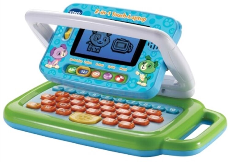 Laptop und Tablet in einem!, Der Laptop lässt sich kinderleicht in ein Tablet mit Touch-Screen verwandeln, 10 Zahlentasten und 26 Buchstabentasten, 1 Pfotentaste, Modus-Schalter, Spaß-Taste, 5 Spielmodi, 10 Aktivitäten: Buchstaben: Buchstaben und ihre Laute Tier-ABC: jedem Buchstaben ist ein Tier zugeordnet, Buchstabenblasen platzen lassen Zahlen: 1 bis 10 Nachrichten: Scout und Violet verschicken lustige Nachrichten, auf die das Kind per Textnachricht oder per Emoji antworten kann Spiele: Interessante Tierfakten Bildausschnitte erkennen und durch das Drücken der richtigen Buchstabentaste vervollständigen, Dinge finden Musik: 2 gesungene Lieder zu den Themen Buchstaben und Zahlen 13 Melodien, LCD-Bildschirm, Mit praktischem Tragegriff, Die beiden niedlichen Hündchen Violet und Scout führen durch die verschiedenen Spiele und Aktivitäten, Lerninhalte: Buchstaben, Buchstabenlaute, Zahlen, Wortschatz, Tiere, Feinmotorik, Schreiben, Personalisierbar: Name des Kindes kann gespeichert werden, Mit Elternkontrollbereich, Kindersicheres Batteriefach und Abschaltautomatik, Lautstärkeregler, Demobatterien enthalten