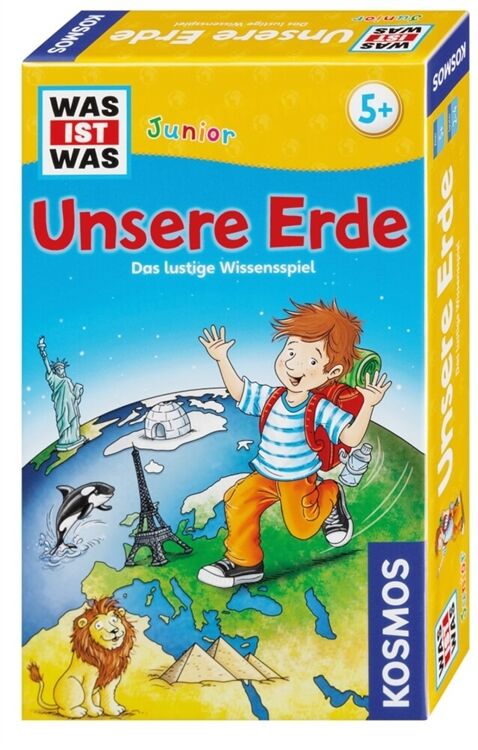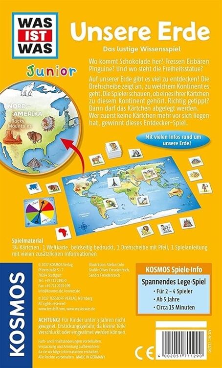 Das lustige Wissensspiel: Wo kommt Schokolade her? Fressen Eisbären Pinguine? Wo steht die Freiheitsstatue? Auf unserer Erde gibt es viel zu entdecken! Die Drehscheibe zeigt an, zu welchem Kontinent es geht. Die Spieler schauen, ob eines ihrer Kärtchen zu diesem Kontinent passt. Richtig getippt? Dann darf das Kärtchen abgelegt werden. Wer zuerst keine Kärtchen mehr vor sich liegen hat, gewinnt dieses spannende Spiel.
