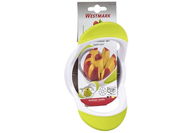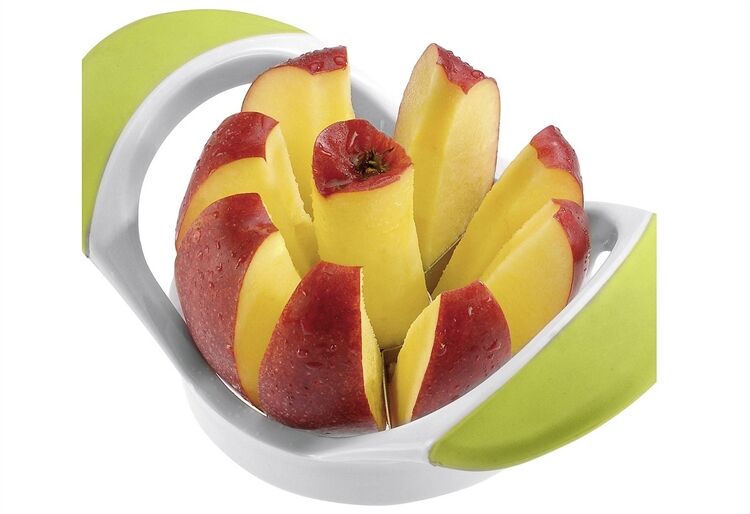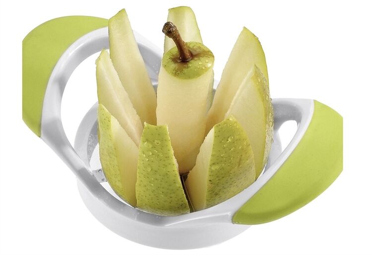 Der Apfel- und Birnenteiler, mit gummierten Griffen, eignet sich zum einfachen und schnellen Entkernen und Schneiden von Äpfeln und Birnen bis zu einem Durchmesser von 9 cm in 8 gleich große Teile.
