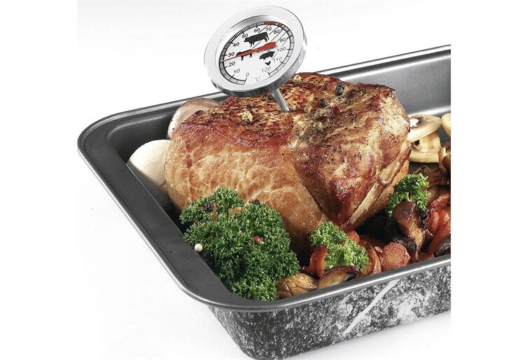 Mit dem analogen Bratenthermometer von Westmark wird Ihr Bratgut nie wieder zu durch oder zu roh sein. Es kann für alle Fleischsorten verwendet werden- egal, ob in der Pfanne oder im Ofen (ofenbeständig bis 250°C). Das Thermometer zeigt die Temperatur im Innern des Gargutes an, mit Symbolen für das einfache Ablesen der richtigen Temperatur bei unterschiedlichen Fleischsorten.