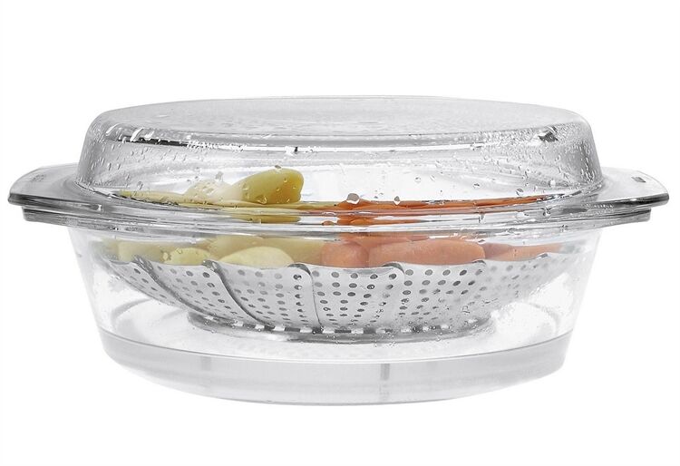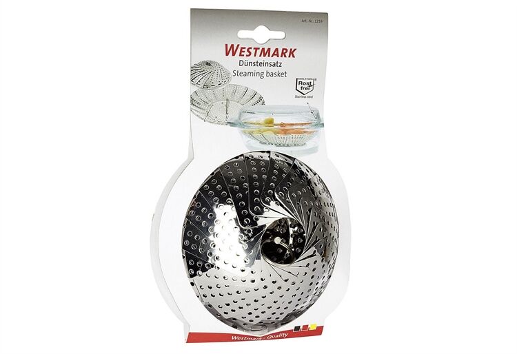 Dünsteinsatz zum Dämpfen, wasserarmen Garen und Blanchieren, für Töpfe von 14 bis 26 cm, beliebig verstellbar. Material: Edelstahl rostfrei.