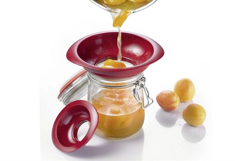 Der Einmachtrichter 'Twix' 2-teilig von Westmark GmbH erleichtert das Einfüllen von Eingemachten in Gläser erheblich. Das Set ist zweiteilig und beinhaltet zwei Trichter in unterschiedlichen Größen. Der kleinere hat oben einen Durchmesser von 7,5 cm und unten 3,8 cm. Der größere Trichter misst oben 13 cm und unten 7,2 cm. Er ist aus hochwertigem, rotem Kunststoff gefertigt und somit optisch ansprechend. Nach dem Benutzen lassen sich die Trichter einfach in der Spülmaschine reinigen.
