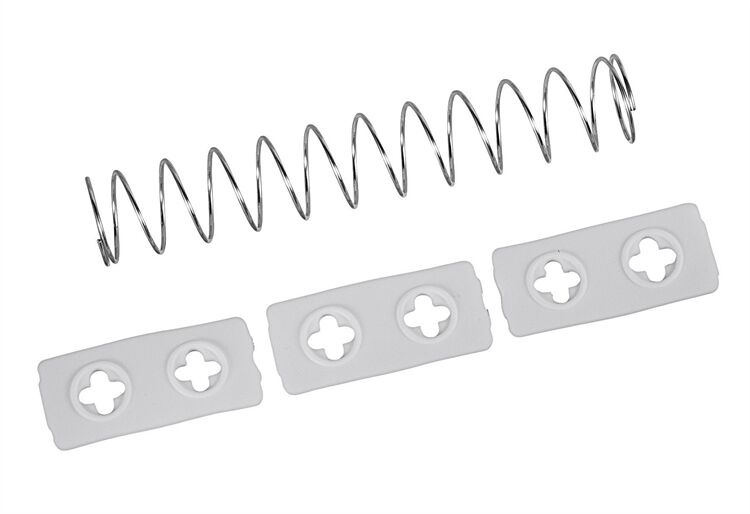 Inhalt: 3 x Gummiplättchen mit zwei Lochungen (4 x 2 cm) und 1 x Stahlfeder (11 x 2 cm)