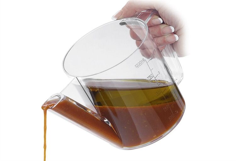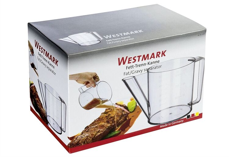 Die praktische Fett-Trenn-Kanne zum schnellen und einfachen Entfetten von Bratensäften, Suppen oder Brühen ist gleichzeitig auch als Messkanne verwendbar (Füllvolumen: 1 Liter). Für fettreduziertes Kochen: Einfüllen von Bratensaft in die Kanne und warten bis sich der Fond am Boden absetzt. Durch das untenliegende Gießrohr wird gezielt der Fond abgegossen. Die Kanne ist hitzebeständig bis 125 Grad und verfügt über eine eingeprägte Messskala mit Milliliter-/Liter- und Unzen-/Pint-Angabe für einfaches Ablesen. Das Made in Germany-Produkt lässt sich einfach von Hand oder in der Spülmaschine reinigen. Empfohlen wird das Einfüllen von abgekühlten Flüssigkeiten.