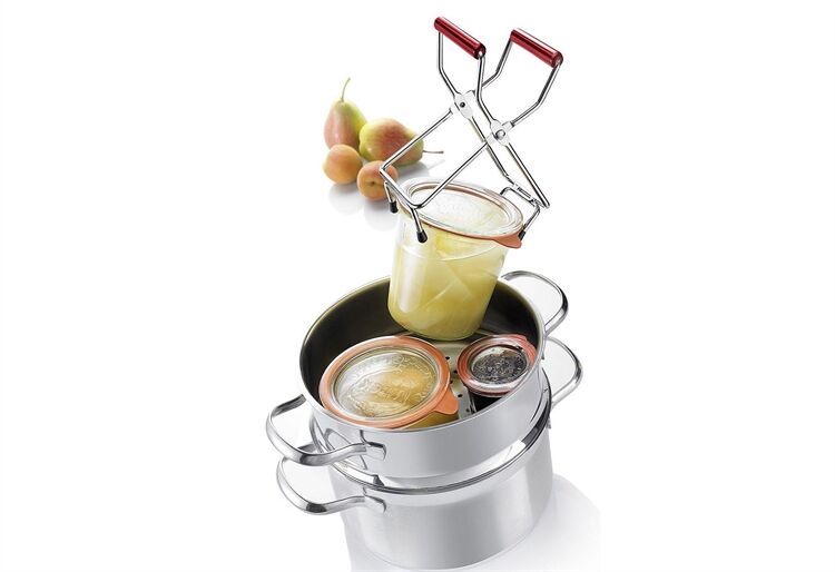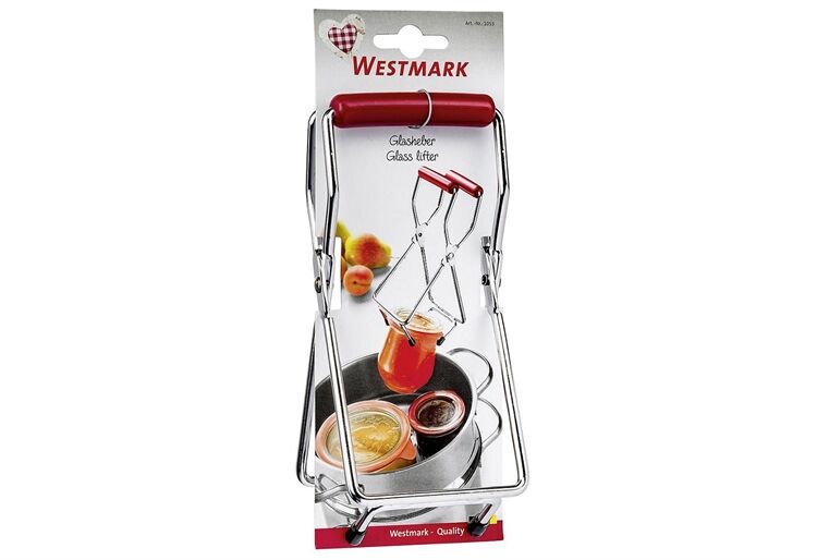 Mit der Westmark Glashebezange lassen sich heiße Einmachgläser leicht aus siedendem Wasser heben. Die Form der Zange ist optimal an Einmachgläser angepasst. Der rote gummierte Griff schützt die Finger vor Verbrennungen. Außerdem können die Hände nicht vom Griff abrutschen. Die Zange der Marke Westmark GmbH ist aus hochwertigem Metall gearbeitet und äußerst langlebig. Dank der 4 Gummifüßchen bietet der Heber guten Halt an Gläsern bis zu einem Durchmesser von 18 cm. Der Konservenheber kann von Hand gereinigt werden und lässt sich einfach in jeder Küchenschublade verstauen. Mit diesem Produkt ist das Einkochen von Gemüse oder Obst kein Problem mehr.