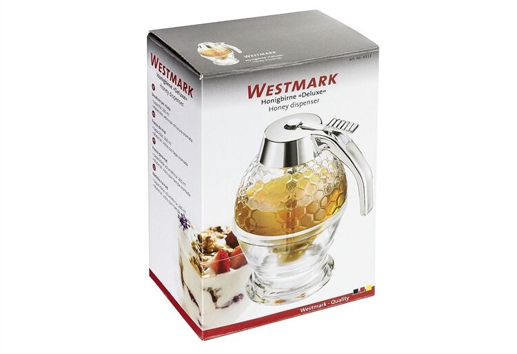 Die Honigbirne aus Glas mit Wabenmuster eignet sich zum einfachen und genauen Dosieren von flüssigem Honig wie Blüten- oder Akazienhonig. Mit diesem Spender können Sie Tee, Brot, Müsli oder Quark verfeinern. Dank schmalem Griff mit praktischem Dosier-Hebel lässt sich die Honigbirne mit nur einer Hand bedienen. Ein kleiner Deckel aus Kunststoff verhindert das Auslaufen des Honigs am unteren Ende. Der Glas-Untersatz sichert den guten Stand. Für eine hygienische Aufbewahrung und Lagerung sogt der festschließende Drehverschluss. Die Birne lässt sich leicht und sauber durch die große Öffnung befüllen. Fassungsvermögen: 200 ml. Spülmaschinengeeignet.