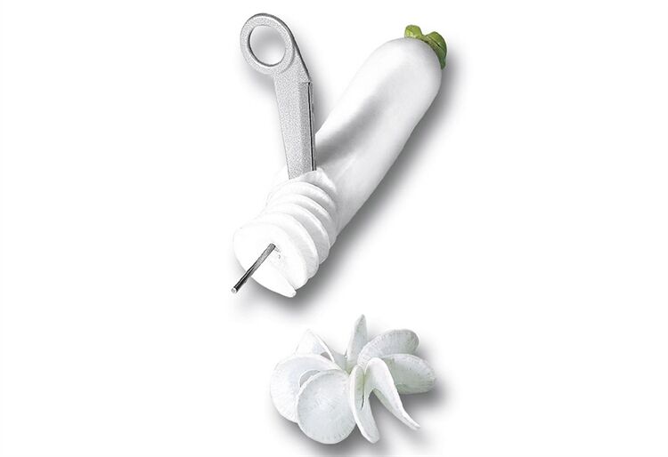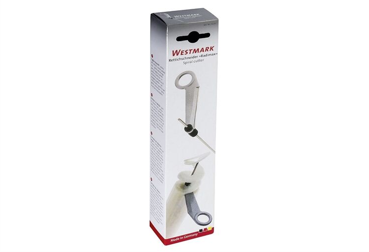 Mit dem Rettichschneider 'Radimax' gelingen perfekte Gemüsespiralen aus Rettich, Gurke oder Zucchini - so lassen sich Buffets professionell dekorieren. Der extra lange Zentrierstab 240 mm ermöglicht einen sauberen, durchgehenden Spiralschnitt. Das Material besteht aus beschichtetem Aluminium mit Messer und Zentrierstab aus rostfreiem Edelstahl und kann problemlos per Hand oder im Geschirrspüler gereinigt werden. Qualitätsprodukt 'Made in Germany'