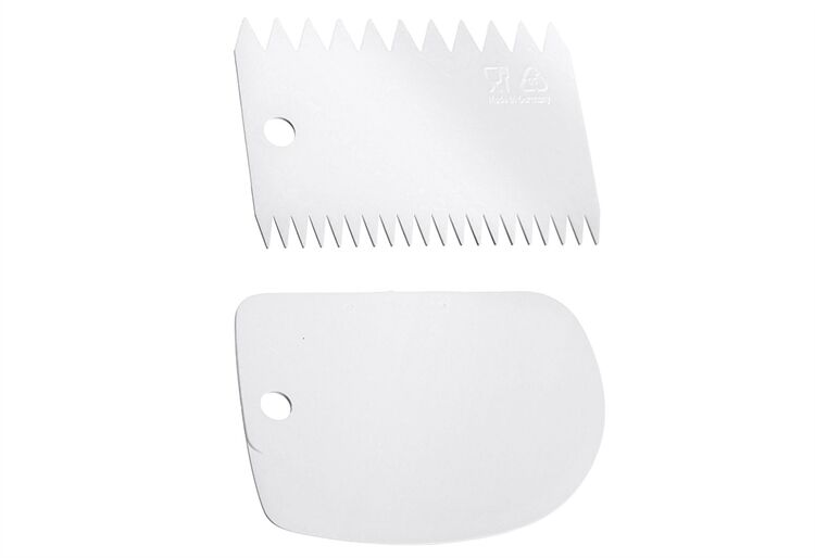Das Set bestehend aus handlichem Teigschaber & Kuchengarnierer mit zwei unterschiedlichen Zahnungen und besteht aus Polypropylen.Es ist spülmaschinengeeignet. Made in Germany.
