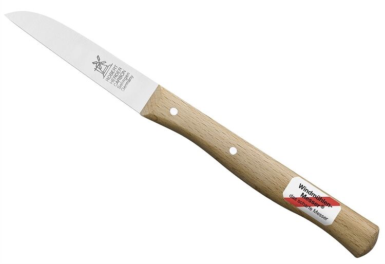 Dieses Küchenmesser gehört zu den absoluten Klassikern der Windmühlenmesser. Es hat einen verlängerten, traditionell ovalen Griff und existiert bereits seit über 80 Jahren in unserem Programm. Natürlich ist es in unserem „Solinger Dünnschliff“ geschliffen und von Hand „feingepließtet“. Klingenlänge ca. 65 mm / 2,5 Zoll, Gesamtlänge ca. 170 mm.