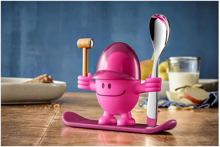 McEgg heißt der freche Eierbecher, der per Surfbrett direkt auf dem Frühstückstisch landet. Mit freundlichem Grinsen passt er auf, dass Ihr gekochtes Ei nicht davon rollt, wenn Sie es aus der Schale löffeln. Doch zuerst heißt es: Ei köpfen. Dafür schlagen Sie mit dem beweglichen Hammer die Schale auf und sammeln die Eierschalen in der aufklappbaren Schirmmütze. Praktisch: Den Eierlöffel aus Cromargan® Edelstahl Rostfrei 18/10 hält McEgg einsatzbereit in der Hand, so können Sie Ihr Frühstücksei sofort genießen. WMF bietet den Eierbecher aus hochwertigem Kunststoff in verschiedenen Farben sowie als McEgg Ball an.