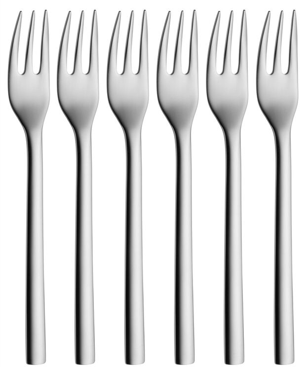 Sie ist die kleine Schwester der Menuegabel: die meist dreispitzige Kuchengabel. Häufig mit einem verstärkten und angeschrägten linken Zinken ausgestattet, portioniert sie Kuchen, Torten oder Gebäck. Auch Obst und Dessertspeisen lassen sich mit einer Kuchengabel leicht genießen. Die kleinen Gabeln erhalten Sie als Einzelstück oder als Bestandteil eines Sets.Für die Kollektion Nuova entwarf Designerin Jutta Keil Spezialbesteck für köstliche Momente - vom Brunchmesser über den Kuchenheber bis zum Salatbesteck. Sie kommen zum Einsatz je nach Situation und Gusto: Eierlöffel für wachsweiche Frühstückseier, Lasagneheber für herzhafte Nudelaufläufe, Espresso- und Latte macchiato-Löffel für italienische Kaffeespezialitäten. Mit den Zangen der Kollektion setzte sich Designer André Stocker kreativ auseinander und entwickelte eine Universal- und eine Pastazange sowie die Spargel- und die perforierte Servierzange. Letztere greift zum Beispiel nach Mozzarella und Tomaten - die Marinade bleibt auf dem Teller. Das Spezialbesteck und die formstabilen Zangen sind aus poliertem Cromargan® gefertigt, im schlichten, zeitlosen Design passen sie zu jedem Tischgeschirr. WMF bietet die Besteckteile einzeln oder im Set, zur Reinigung kommen sie in die Spülmaschine.- Inhalt: 6 Kuchengabeln. Länge: 16,0 cm. | Artikelnummer: 1291666046- Material: Cromargan Edelstahl 18/10 poliert. Rostfrei, spülmaschinenfest, formstabil, hygienisch, säurefest und unverwüstlich.- Design: Jutta Keil.- In hochwertiger Geschenkverpackung.- Kollektion Nuova